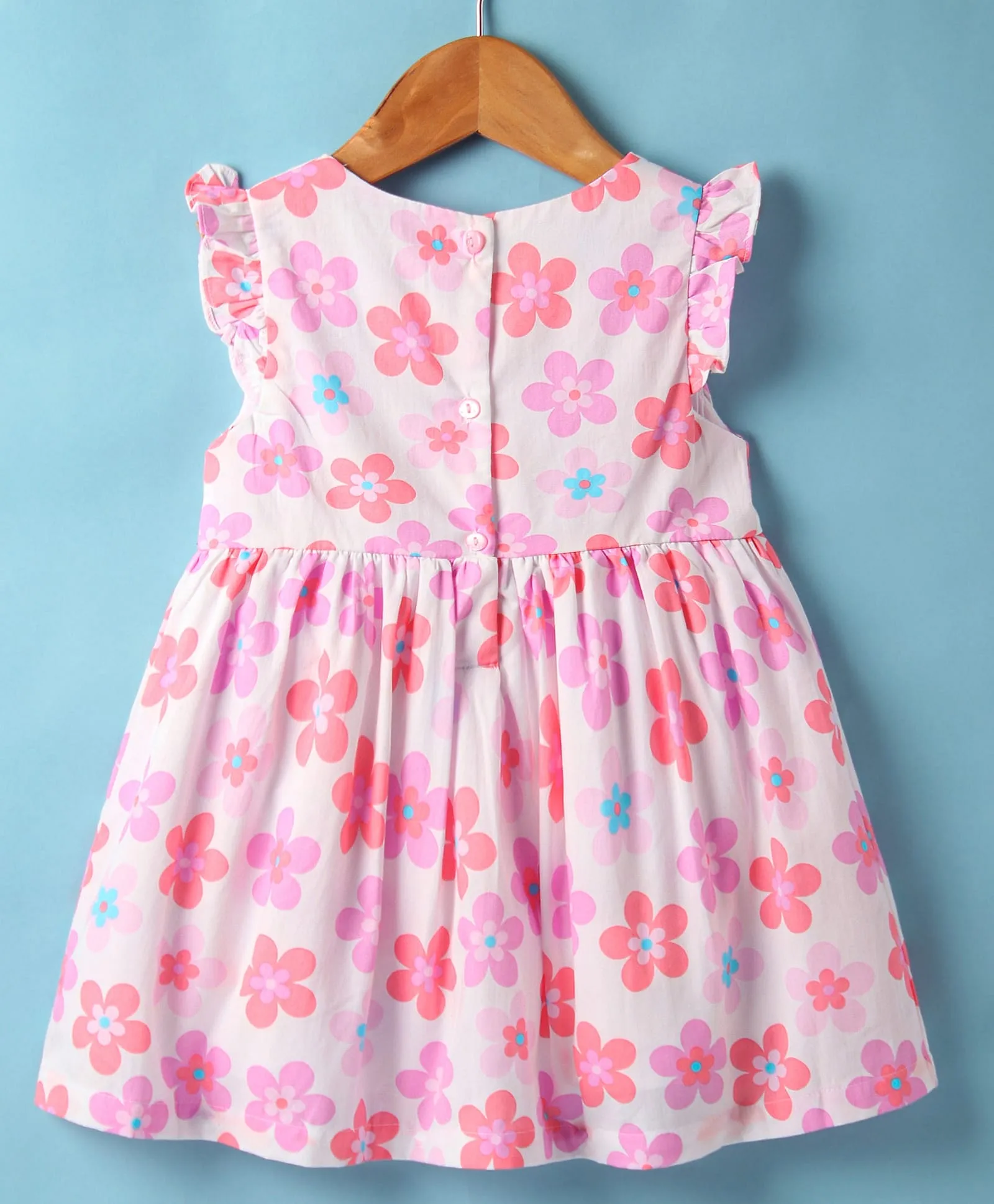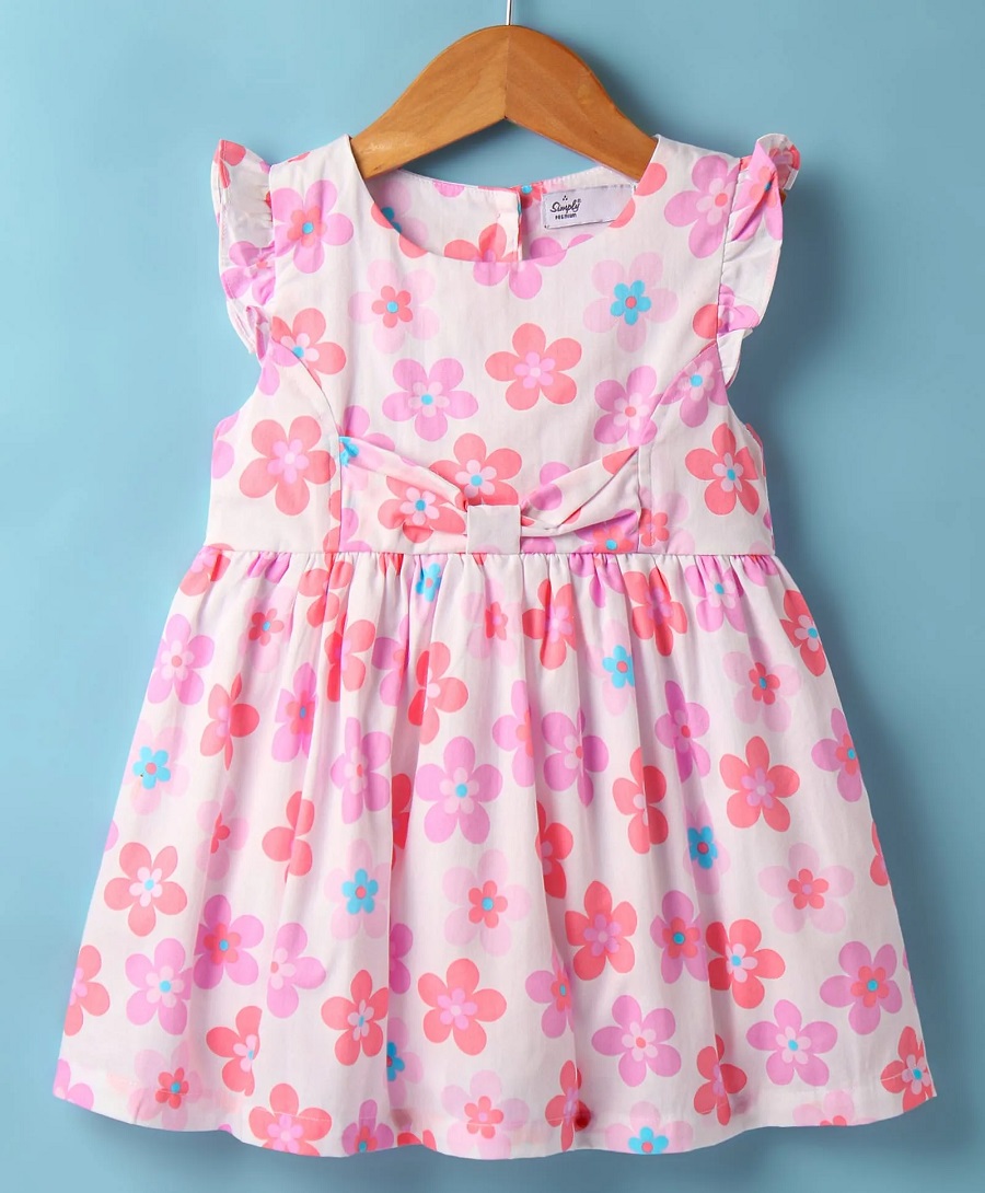 Adorable floral printed frock with frill sleeves and cute waist bow, made from soft cotton fabric for all day comfort and style.