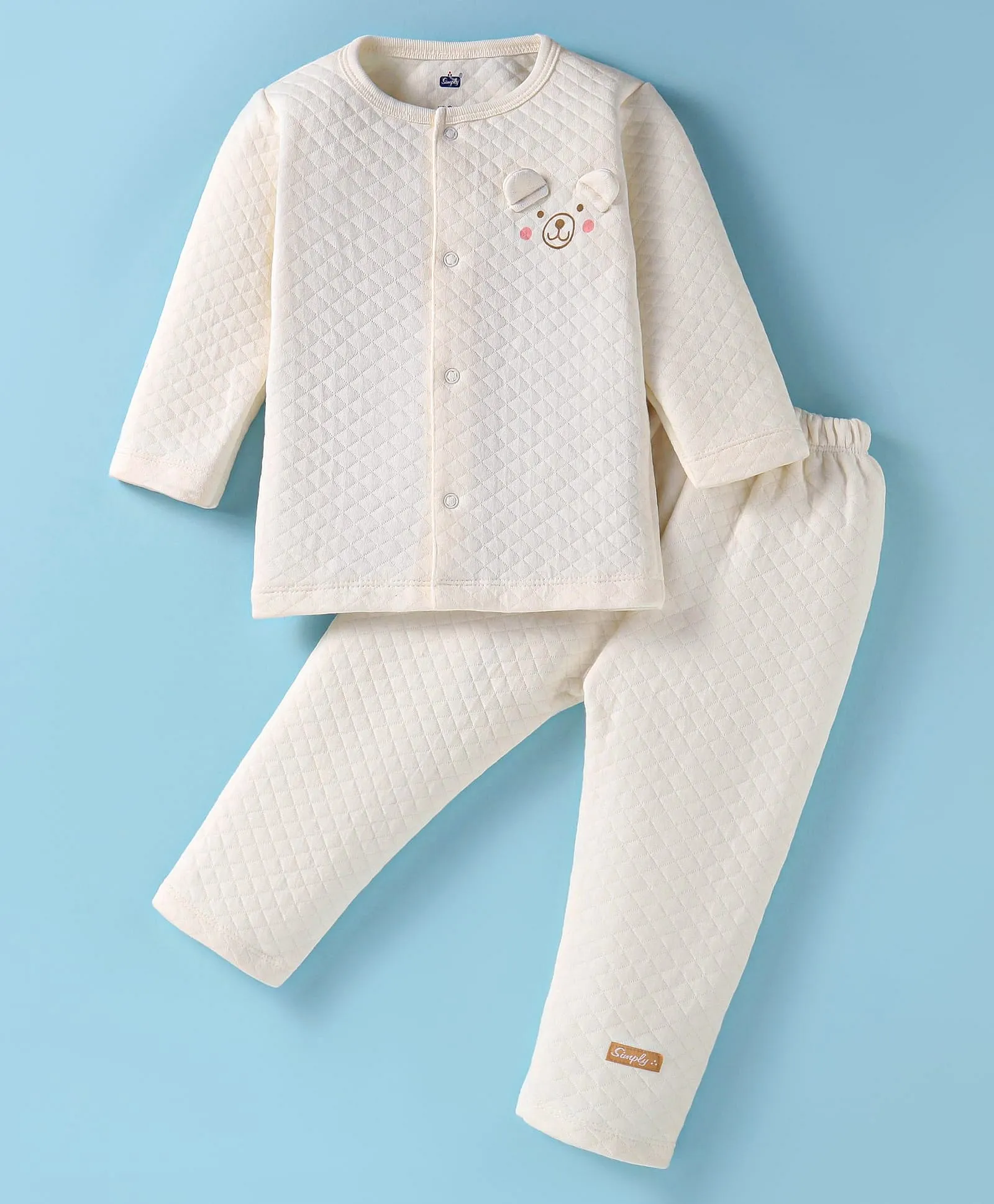 Warm cotton night suits with a cute bear applique, perfect for cozy winter nights.