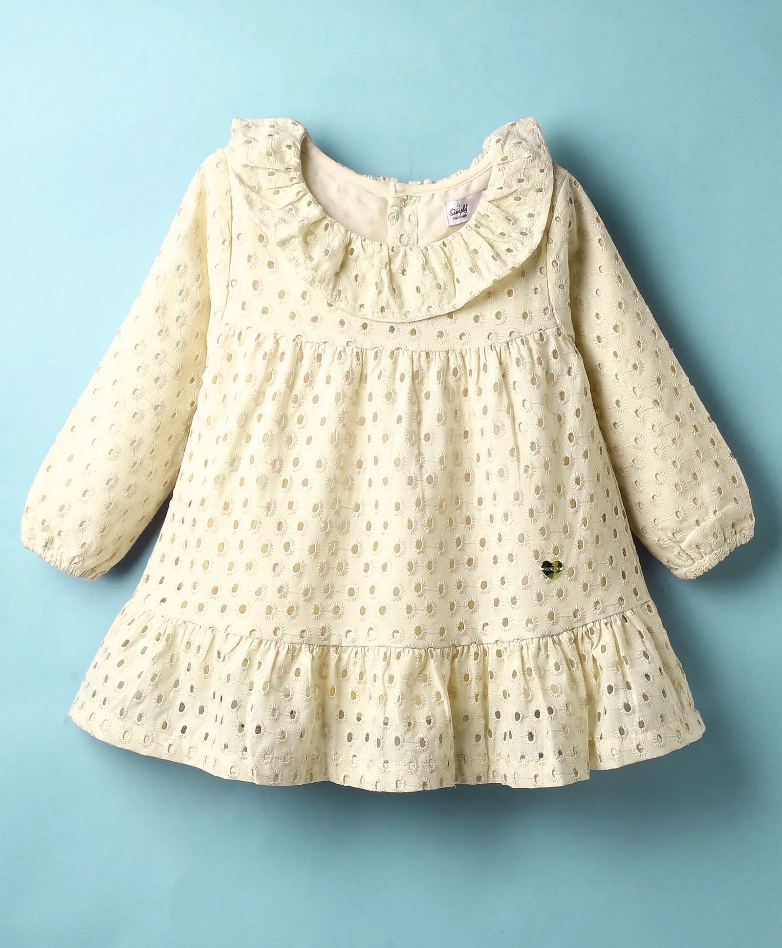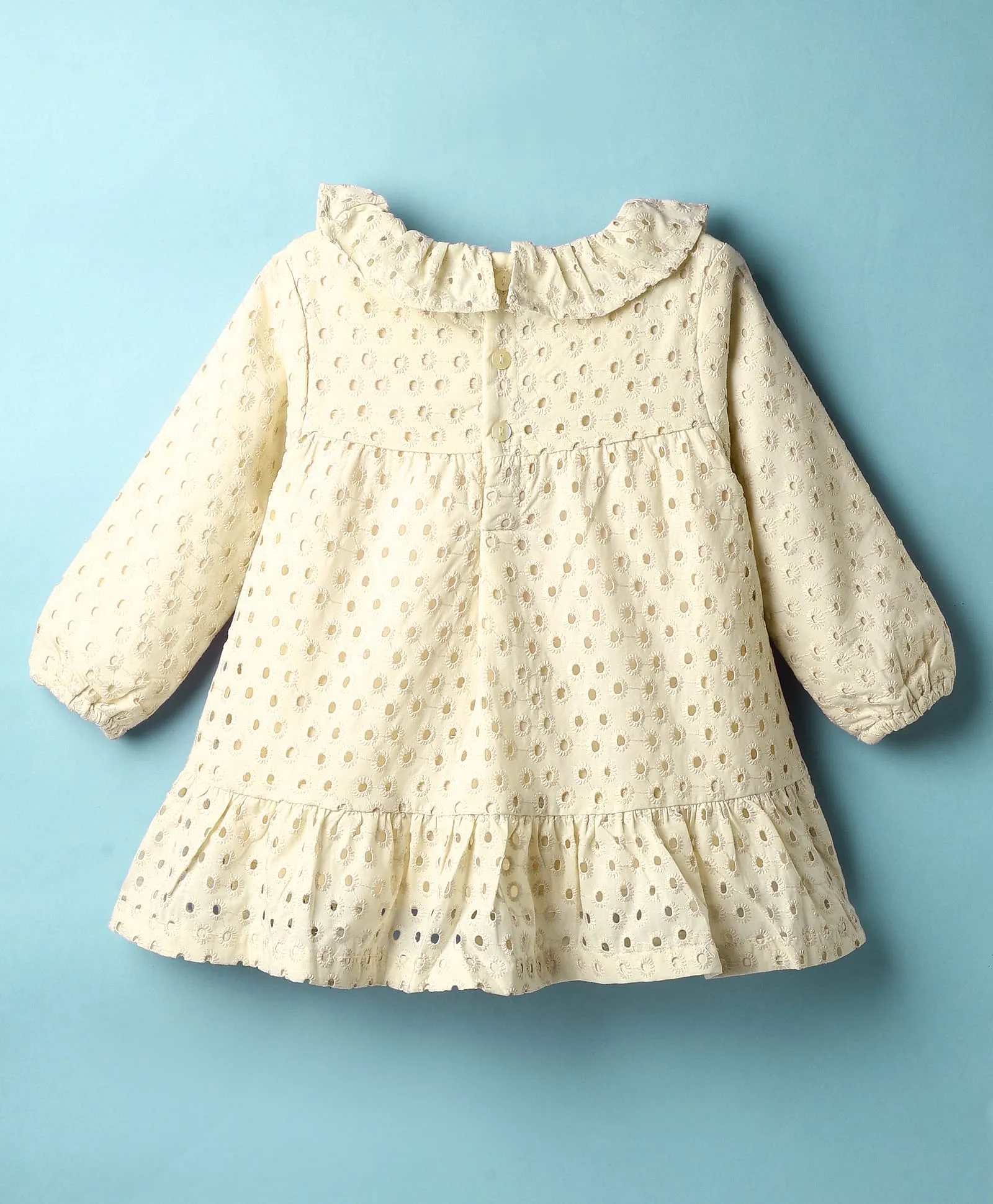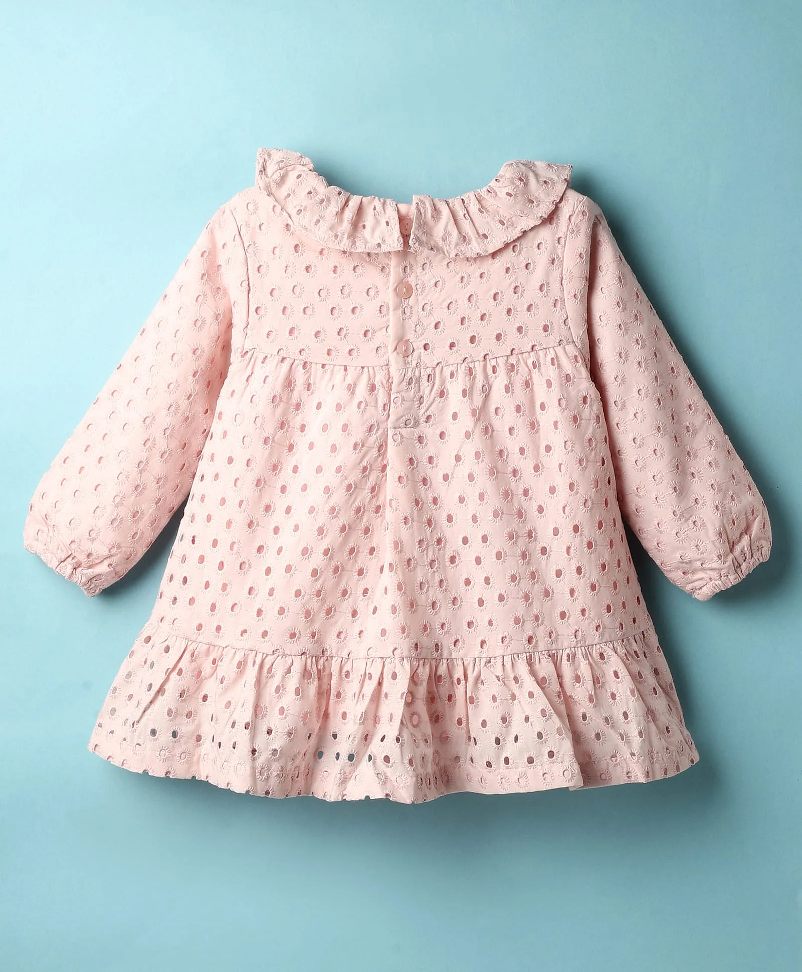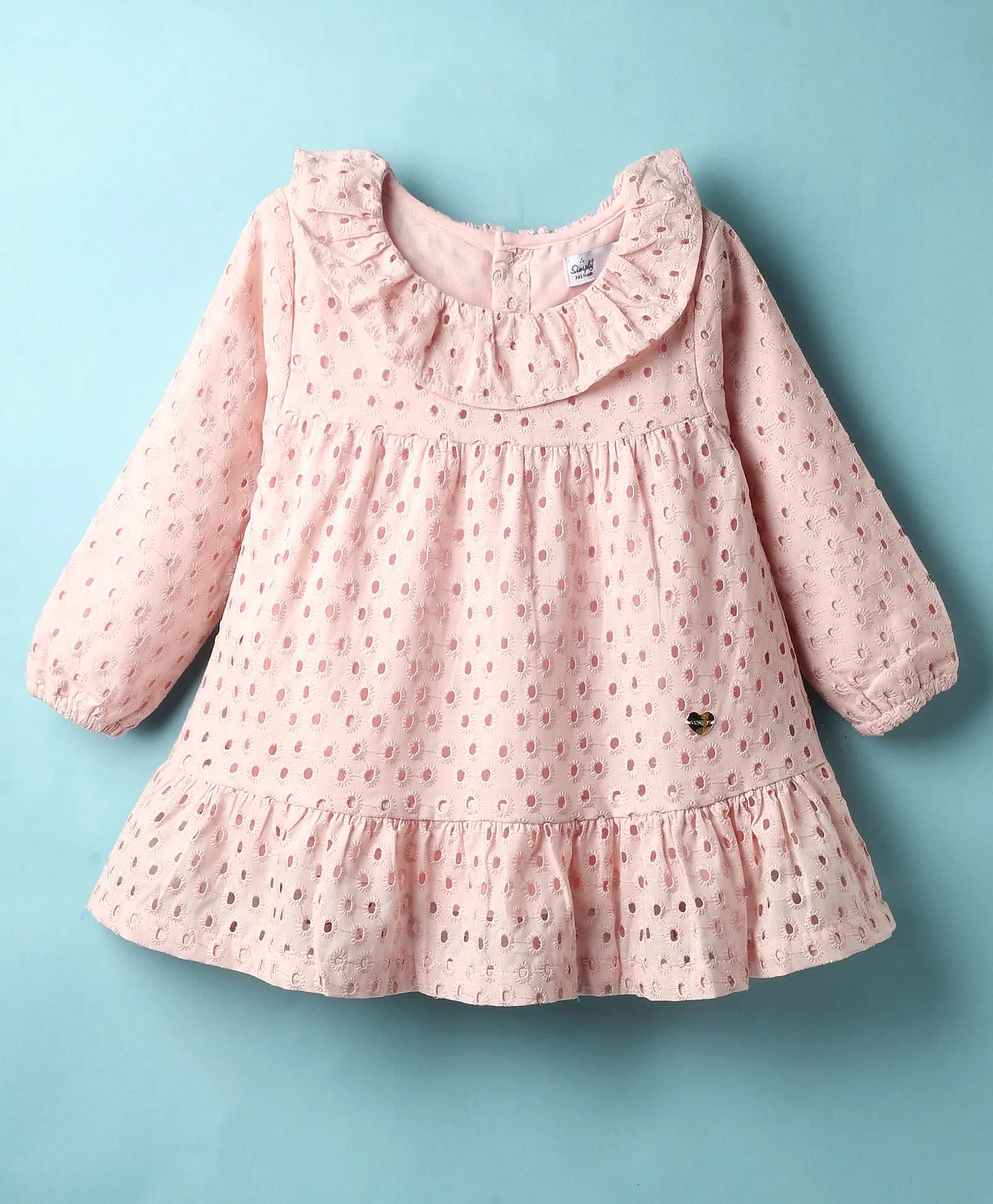 Elegant full sleeves frock with all over embroidery and frill detailing, designed for a cute, classy, and comfortable look for your little one.