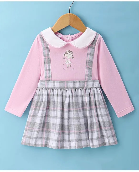Cute and comfortable baby girl frock with a soft pink top and plaid pinafore-style skirt, perfect for daily wear.