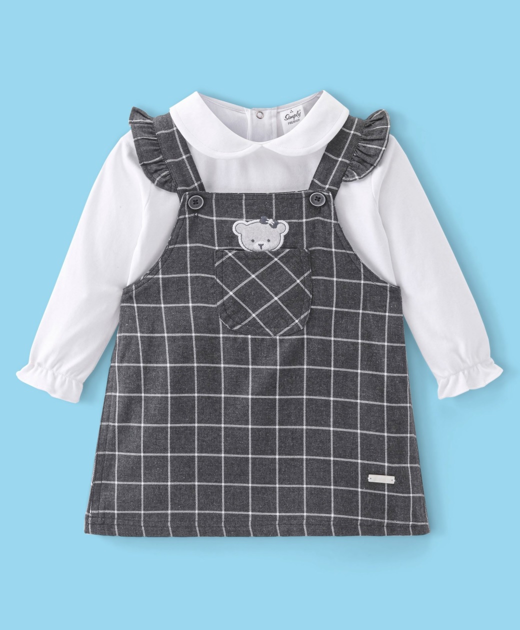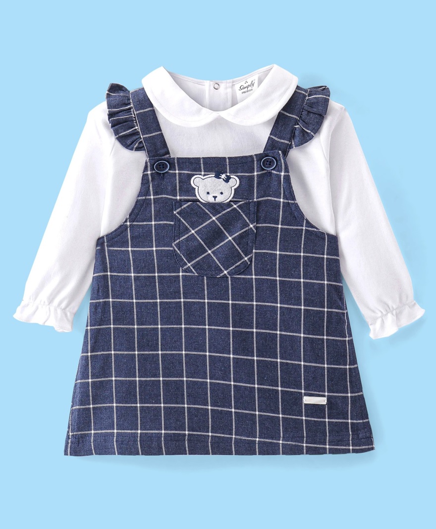 Stylish peter-pan collar with back button closure inner & checks with bear embroidered pinafore for girls.