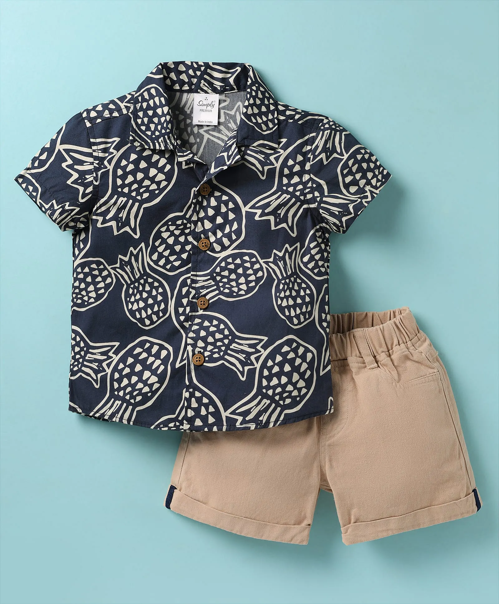 A navy pineapple printed half sleeve shirt paired with soft beige shorts for a cool everyday look.