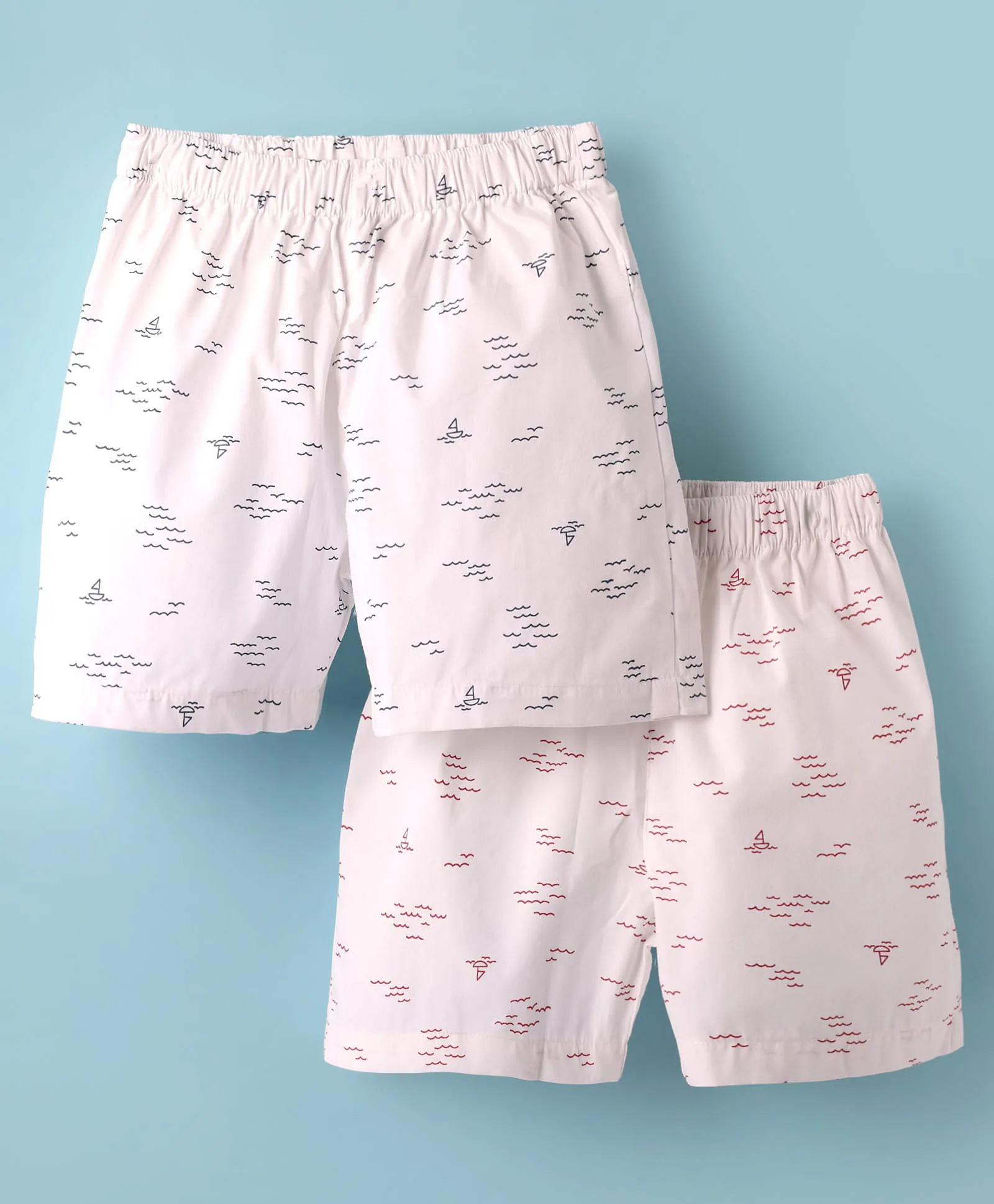 Soft and breathable cotton woven knee-length shorts for babies, featuring a nautical themed print and an elastic waistband for a comfortable fit.